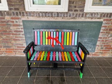 Seit letzter Woche steht auf unserem Schulhof eine liebevoll gestaltete Bank. Aber diese Bank ist nicht einfach nur zum Sitzen…