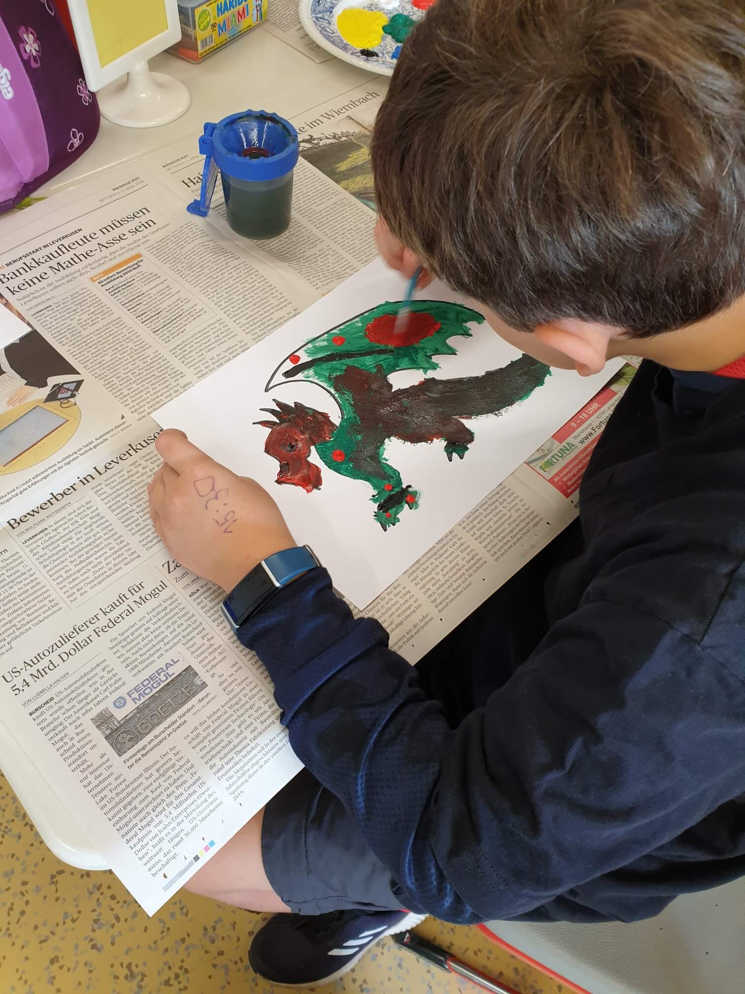 Wir malen mit „richtigen“ Farben, damit die Drachen an den Fenstern auch toll leuchten.